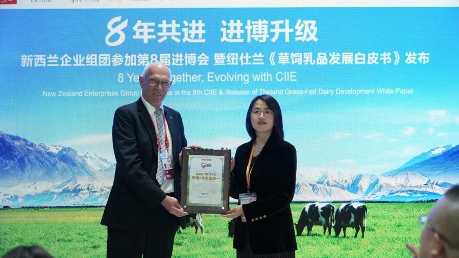 从卢库牧场的百年传承,到开创草饲乳品入华先河;从推动行业标准建立,到连续7年市场领先认证;立足进博舞台,纽仕兰的发展轨迹,与中国乳品消费升级的步伐同频共振。第八届进博会上,新西兰乳企纽仕兰正式发布《草饲乳品发展白皮书》,推动《新西兰乳品草饲管理标准》于2025年正式出台。