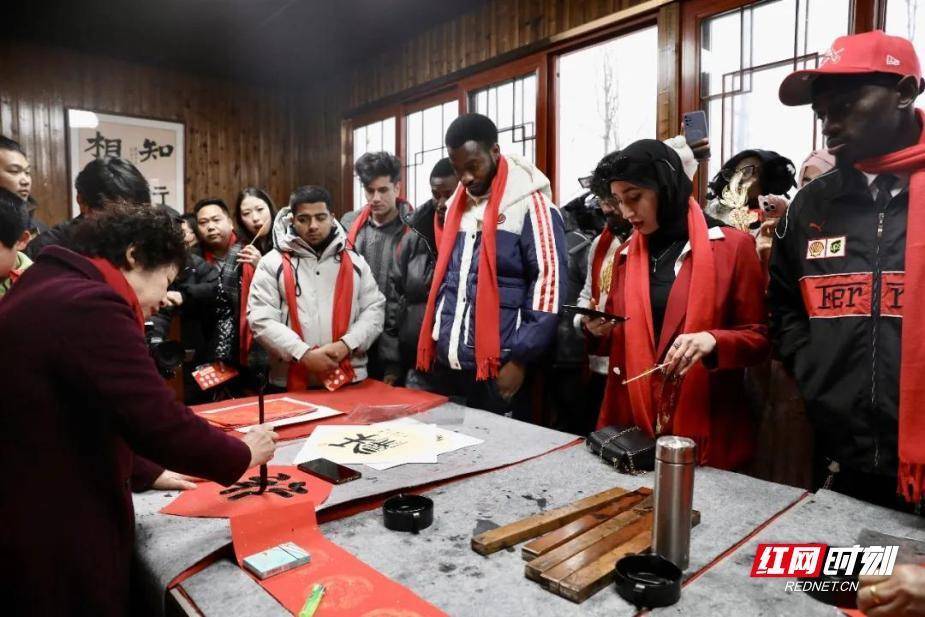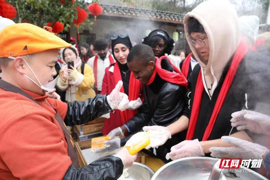 留学生们聚在“墨香工坊”前,认真体验着中国书法的魅力。红网时刻新闻2月7日讯(通讯员 赵春怡)“老师,你看我写的‘福’字怎么样?”2月7日上午,在雁峰区岳屏镇山林村,来自南华大学的留学生们聚在“墨香工坊”前,认真体验着中国书法的魅力。当天,“乡村民俗体验”活动热闹在此开场,来自不同国家的数十位留学生,与本地居民一起沉浸式感受中国新年的独特韵味。活动现场,“年味探索地图”成为了留学生们的最佳指引。糖画摊位前排起了长队,非遗传承人手执铜勺,糖浆流转间,一个个栩栩如生的生肖图案便跃然“板”上,引得留学生们纷纷举起手机记录这神奇的瞬间。打糍粑体验区更是热闹非凡,来自不同国家的学子们轮流举起木槌,在石臼中捶打糯米,现场充满了欢声笑语和糯米的香甜气息。在衡阳特色鱼丸制作区,师傅们向大家展示了鱼丸的制作过程,留学生们在指导下亲手尝试,体验着这道传统美食的制作乐趣。
