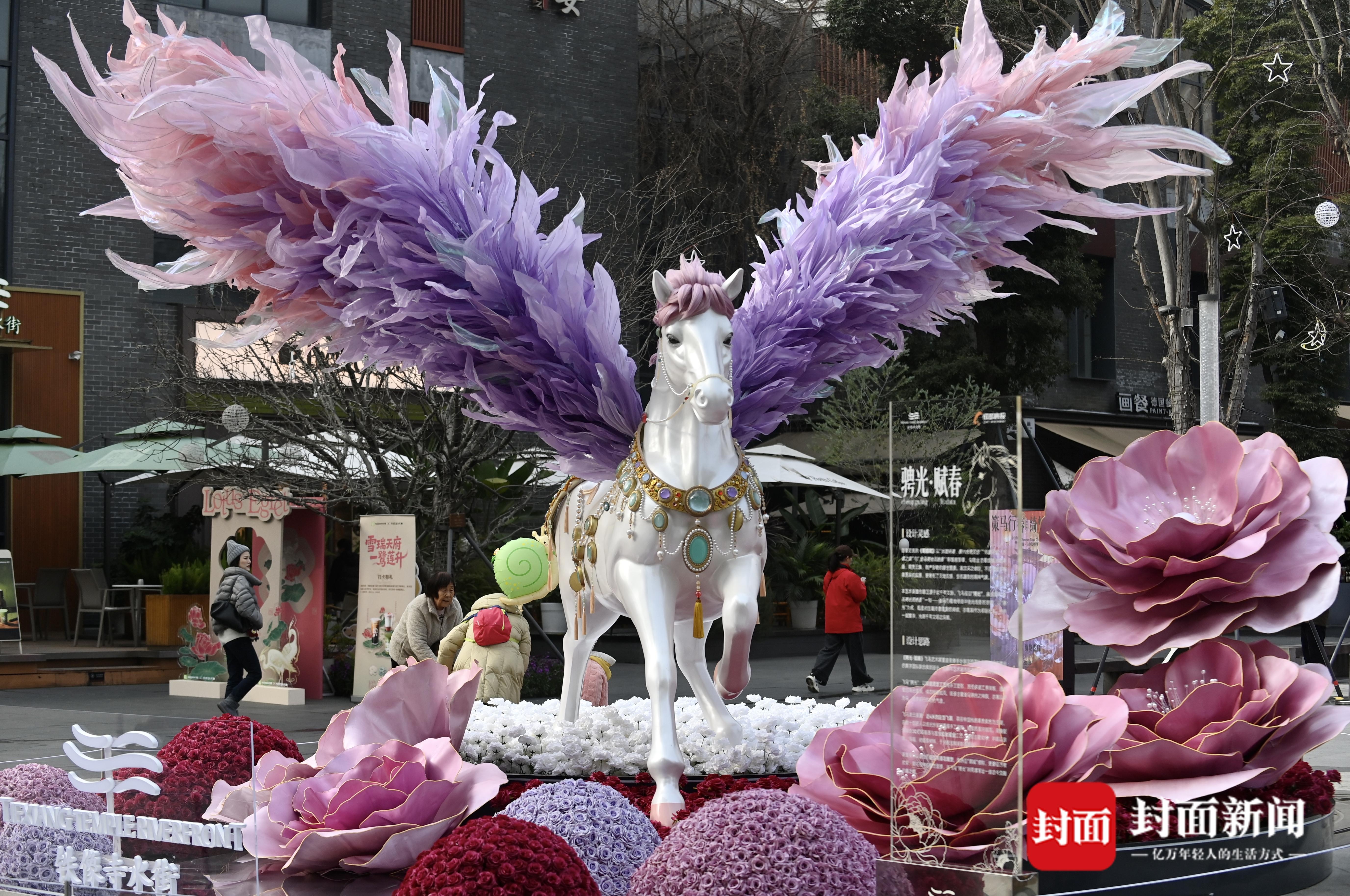 近日,成都高新区铁像寺水街街区布景焕然一新。在东入口处,非遗泥塑纯手工塑形的飞马“驰光”雕塑作品更是让人眼前一亮。沿着街区前行,一串串紫色的灯笼挂在路的两边,小游园的木船上花团锦簇,节日的气氛越来越浓。