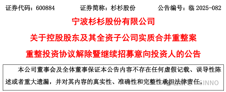 11月8日,宁波杉杉股份(维权)有限公司发布公告称,因《重整计划(草案)》未获债权人会议表决通过,控股股东杉杉集团及其全资子公司朋泽贸易的重整投资协议已依法解除,管理人将重新公开招募意向投资人。这一消息意味着杉杉股份重整进程再度回到起点。